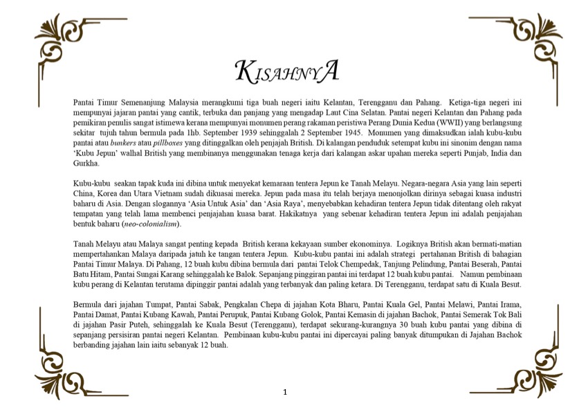 Pantai Timur Semenanjung Malaysia merangkumi tiga buah negeri iaitu Kelantan, Terengganu dan Pahang. Ketiga-tiga negeri ini mempunyai jajaran pantai yang cantik, terbuka dan panjang yang mengadap Laut Cina Selatan. Pantai negeri Kelantan dan Pahang pada pemikiran penulis sangat istimewa kerana mempunyai monumen perang rakaman peristiwa Perang Dunia Kedua (WWII) yang berlangsung sekitar tujuh tahun bermula pada 1hb. September 1939 sehinggalah 2 September 1945. Monumen yang dimaksudkan ialah kubu-kubu pantai atau bunkers atau pillboxes yang ditinggalkan oleh penjajah British. Di kalangan penduduk setempat kubu ini sinonim dengan nama ‘Kubu Jepun’ walhal British yang membinanya menggunakan tenaga kerja dari kalangan askar upahan mereka seperti Punjab, India dan Gurkha.